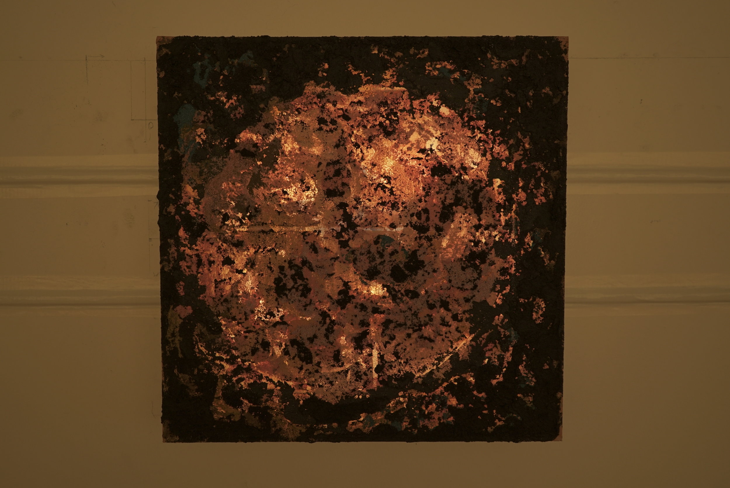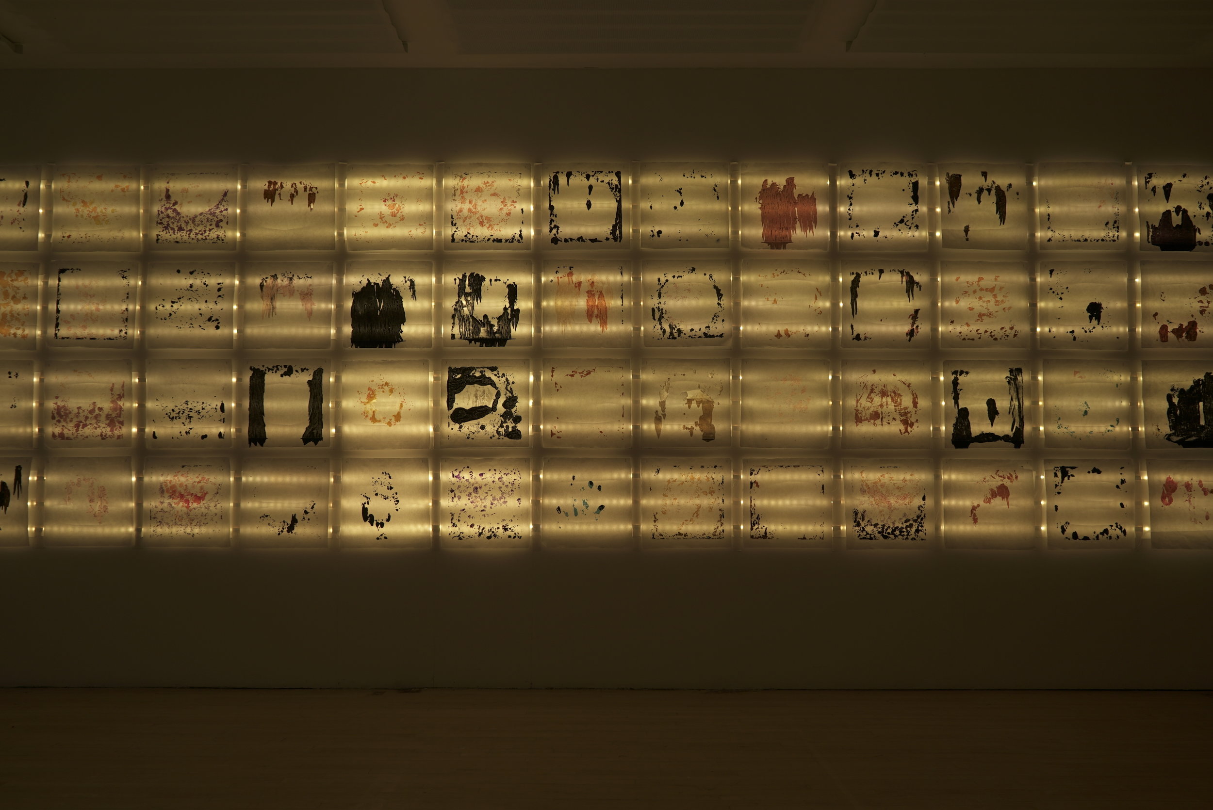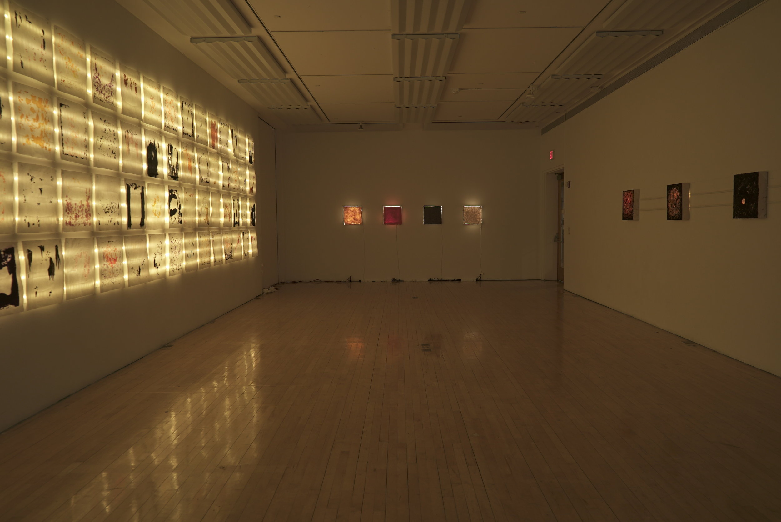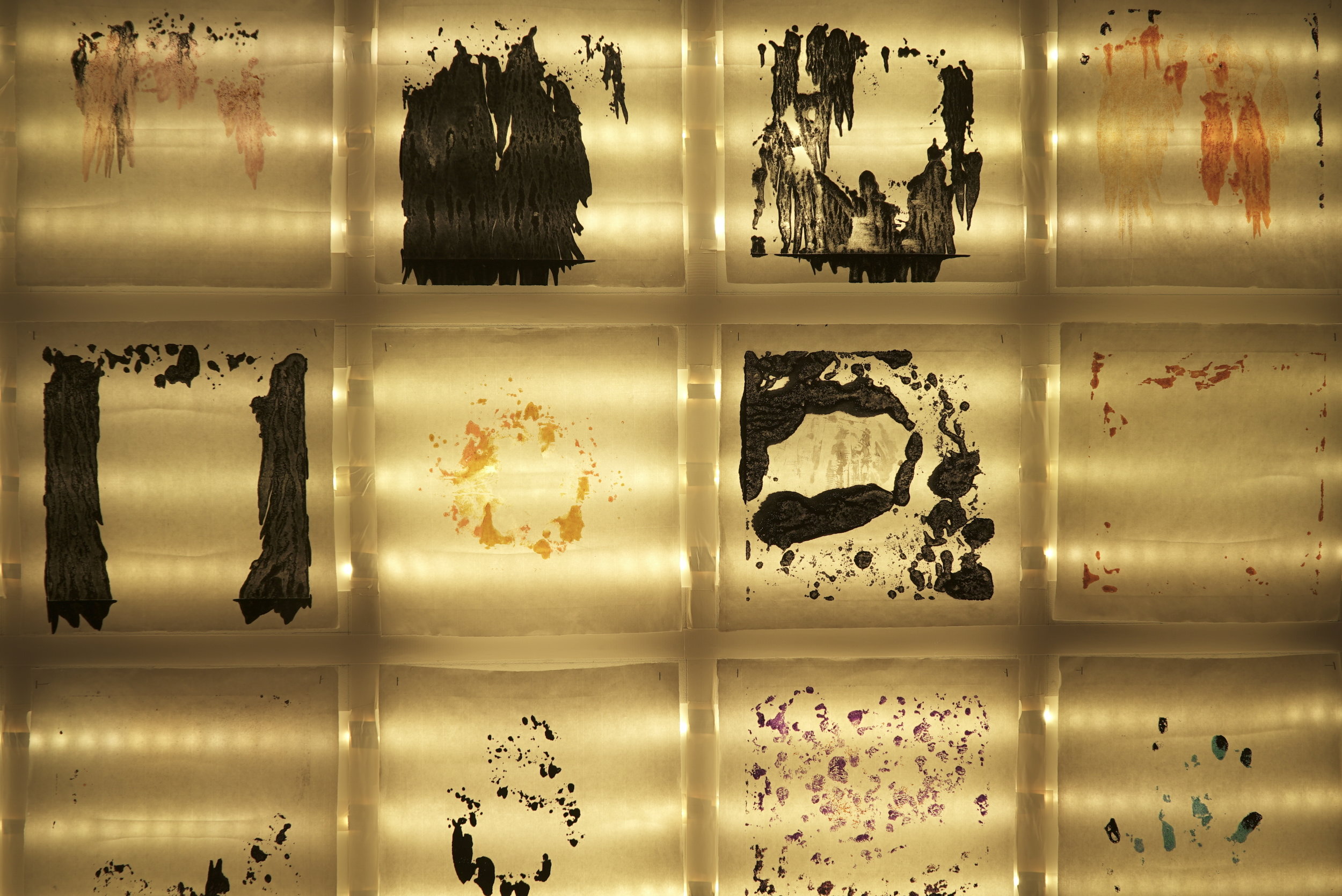 Annotations takes screen shots of burn footage, digitized from the 18’x2′ light table in wax notes, as source images for acrylic paintings and monotypes.